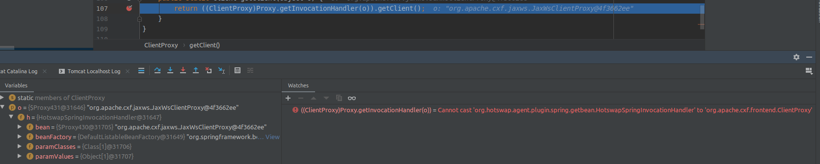 Caused by: java.lang.ClassCastException: org.hotswap.agent.plugin.spring.getbean.HotswapSpringInvocationHandler cannot be cast to org.apache.cxf.frontend.ClientProxy