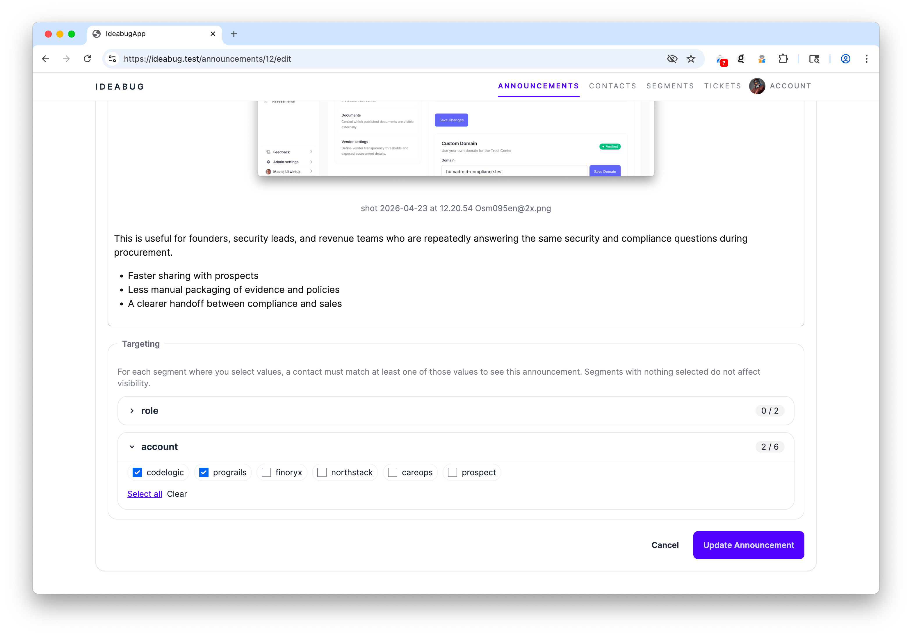 Note on AND semantics: the current rule is "contact shares ≥1 segment value with the announcement." If you need strict AND-across-segments ("must be Pro and in EU"), file a feature request — it's a query-level change in