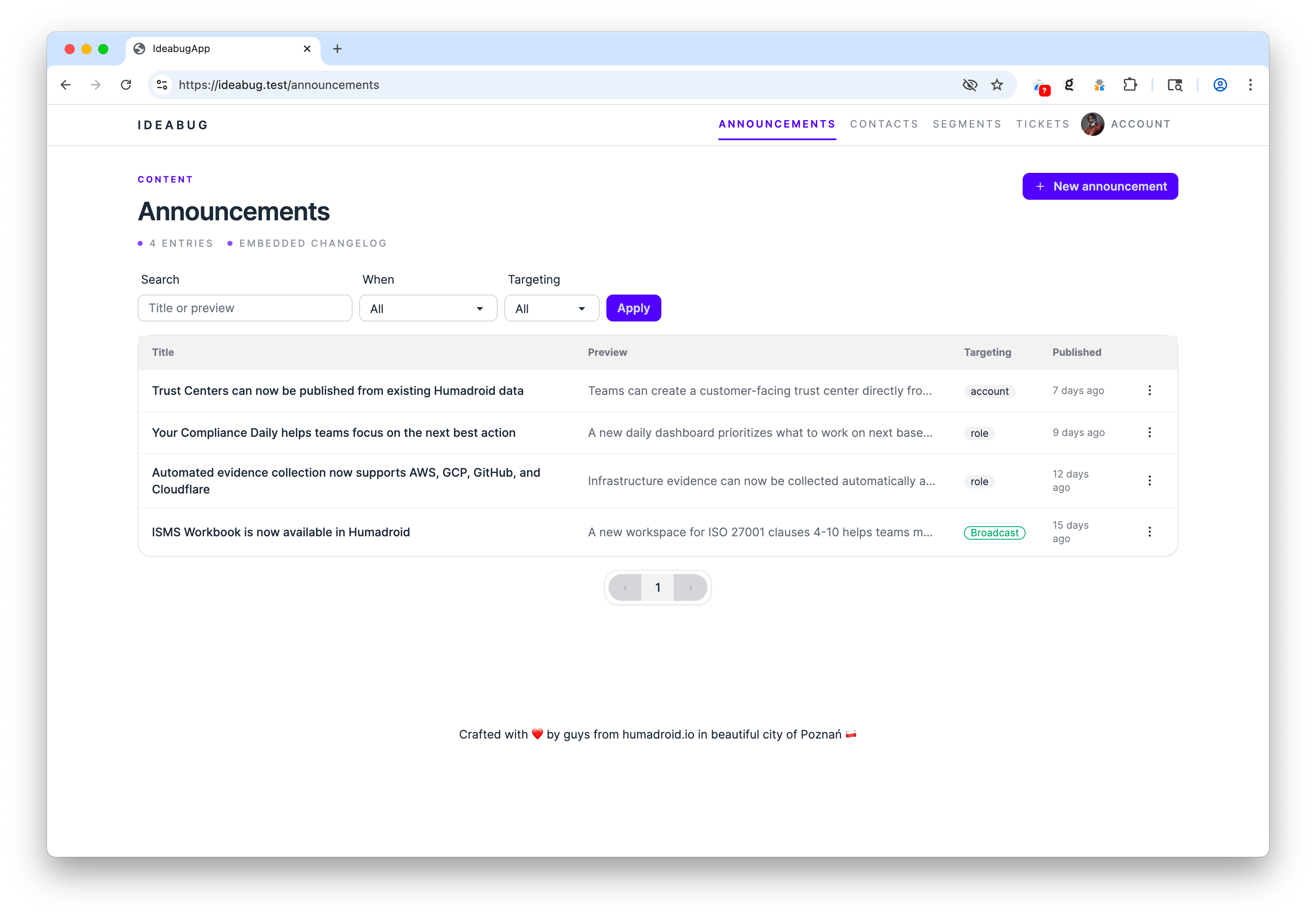 vendor/javascript/ideabug_widget.js(POLL_VISIBLE_MS,POLL_HIDDEN_MS). - Announcement window — "unread" decay is 1 month; tune