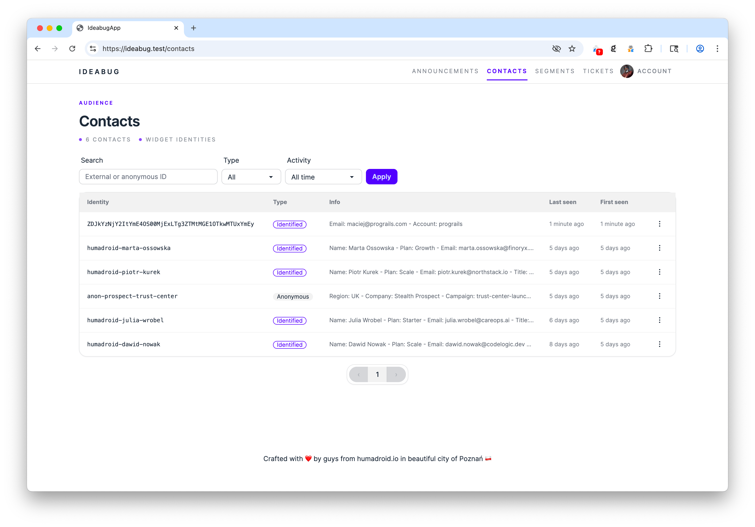 window.IdeabugWidget.configure({ pollInterval: 30000 });If your app already has authenticated users, you can promote anonymous contacts to identified ones. The widget keeps the original localStorage anon ID and sends it alongside a JWT — the server merges the two contacts on the next request, preserving read-state and votes, then clears the stale anonymous ID from browser storage so it cannot silently recreate the old anonymous contact later.