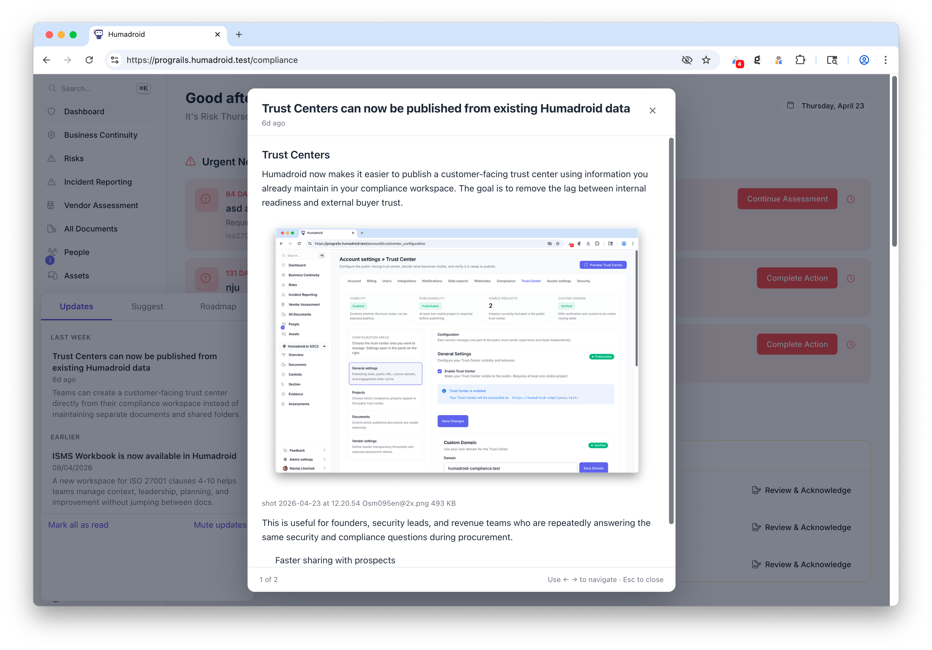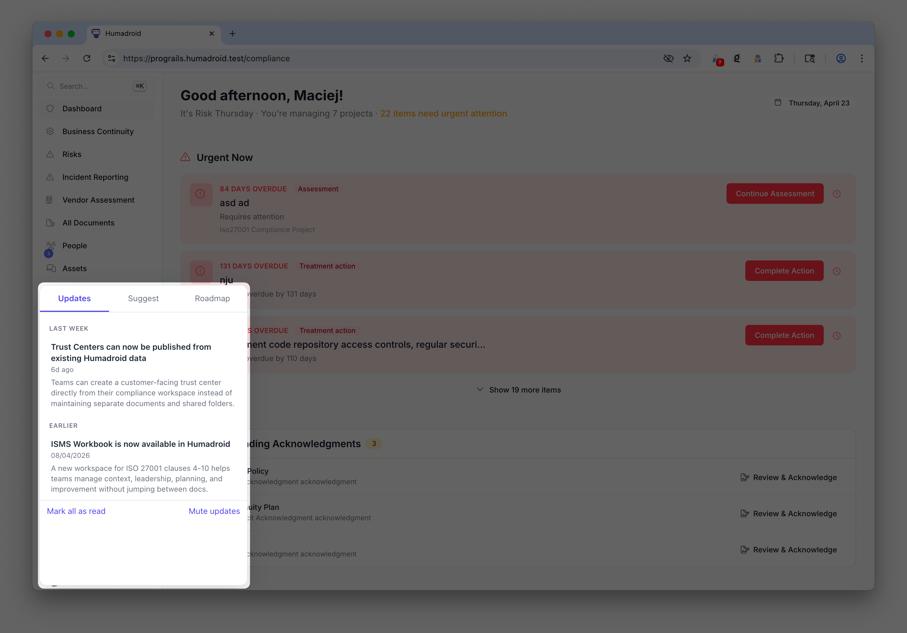 - In-app announcements (changelog / product updates) with read-tracking and per-user mute