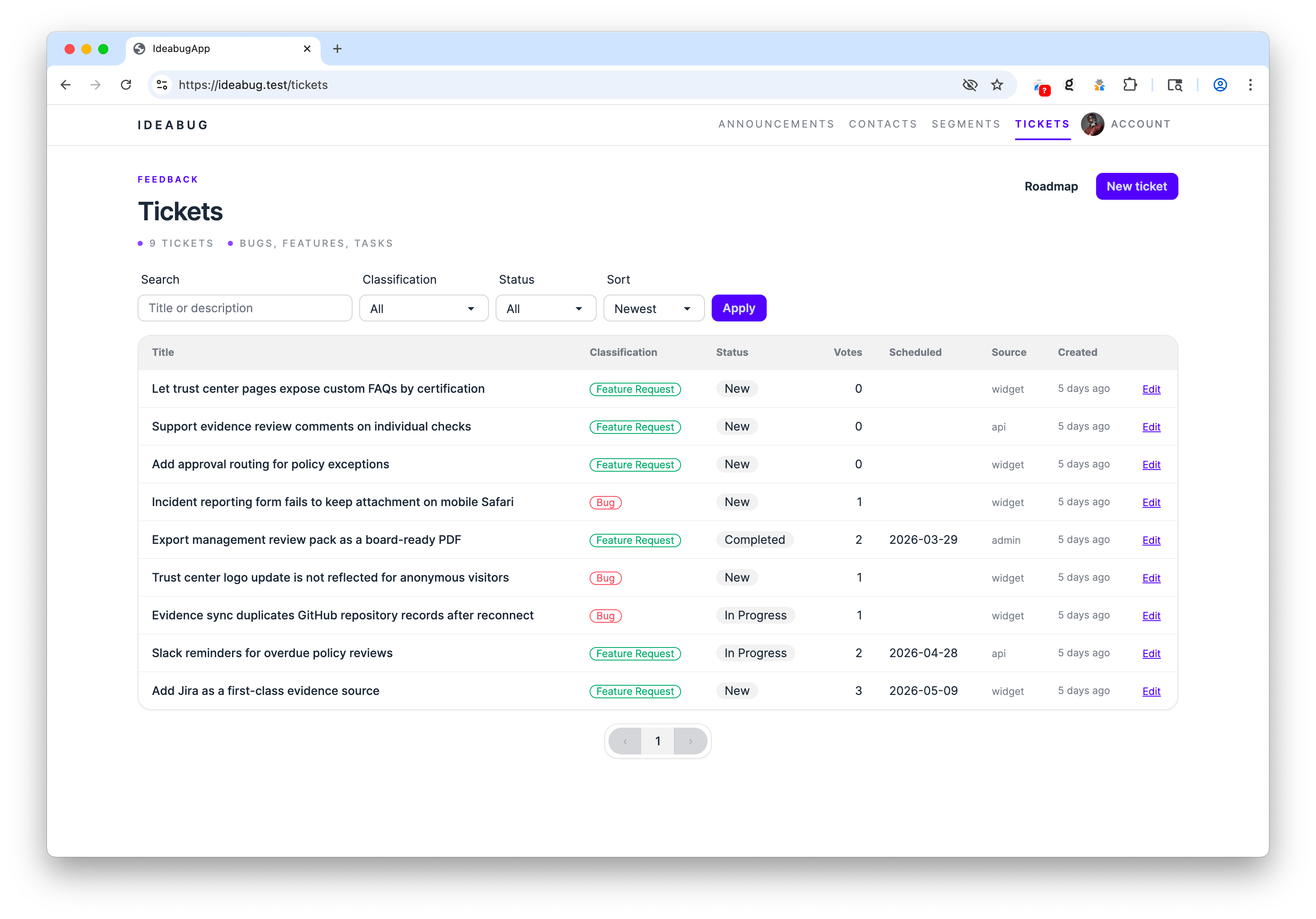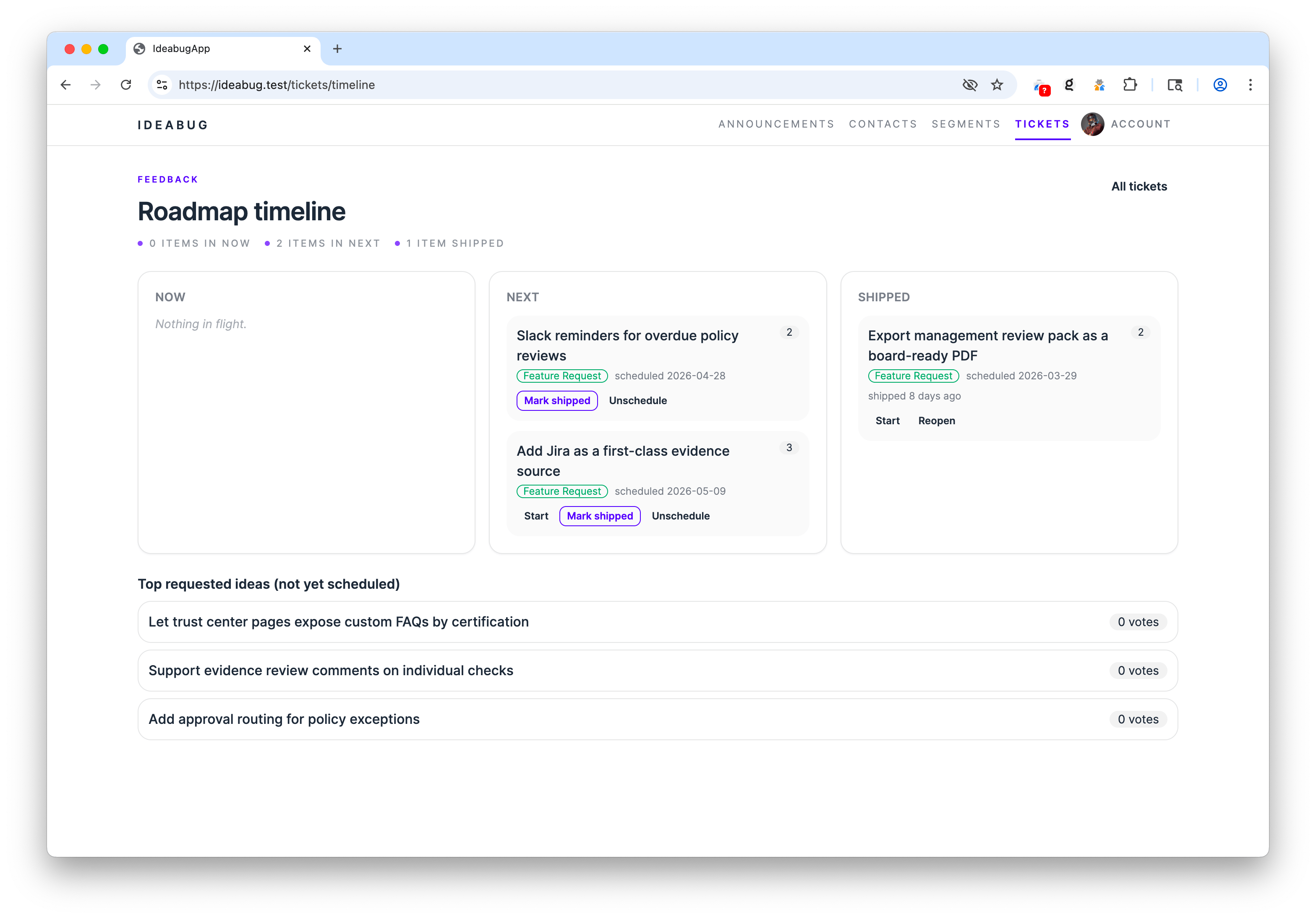 /dashboard— contact / announcement / read / vote stats with weekly sparkline; top-requested features and recent bugs/announcements— CRUD for changelog entries; segment targeting via collapsible per-segment pickers (filter, select-all, clear); rich-text body via Lexxy/tickets— table view with classification / status / search / sort / pagination/tickets/timeline— Now / Next / Shipped lanes; click any card to setscheduled_fororshipped_at/segments— define targeting taxonomy (plan,region, etc.) and allowed values/contacts— read-only list of identified + anonymous contacts; can delete