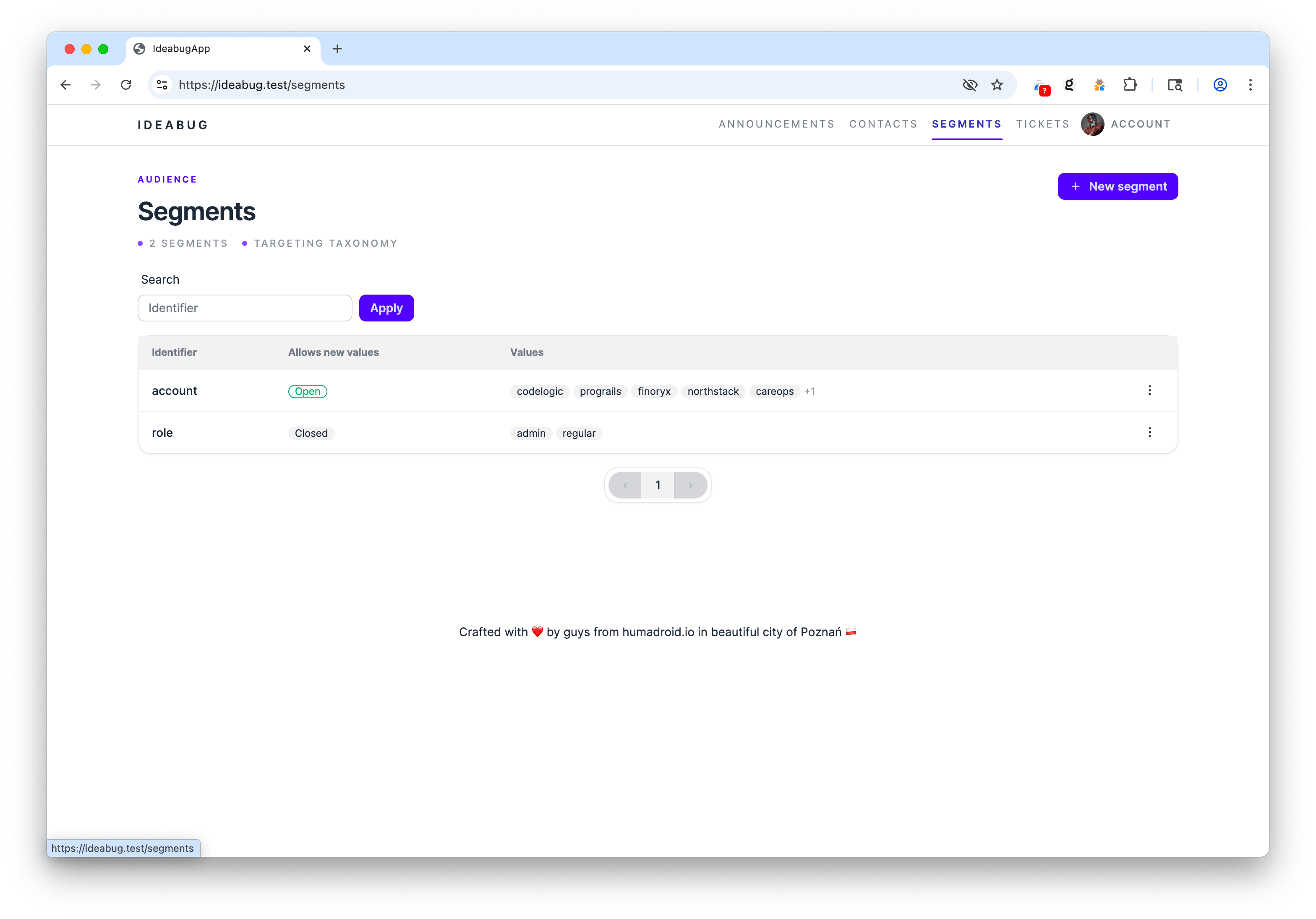 Segments let you slice announcements by user attribute — release a "Pro plan beta" note only to paying users, or a region-specific update only to EU contacts. The model is two-level: