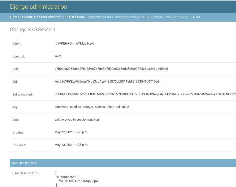 They all are related to session manager, Just this. All this parameters belongs to session manager. But this aspect Is out of scope in this PR, i talked too much on things not related to the scope of this PR. It Just fix few small bugs and now my implementation of storage, in django-oidc-op develop branch, works great. This afternoon I'll add another commit to follow what shared here between US but feel free to suggest, tell, do what you intende to be Better for the roadmap. I accept task 😊 |