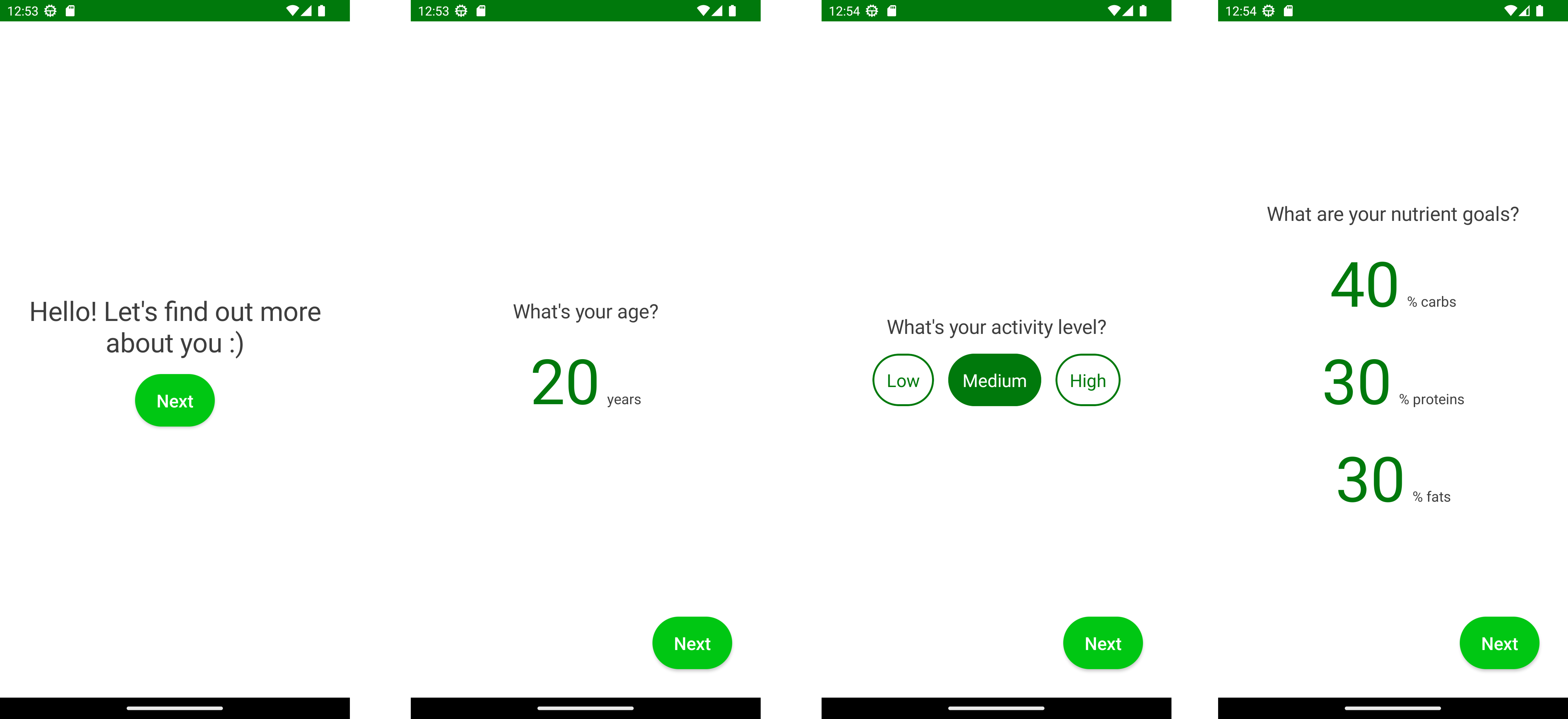 Onboarding contains eight screens collecting personal information used to calculate nutrient goals. Here are some of them: