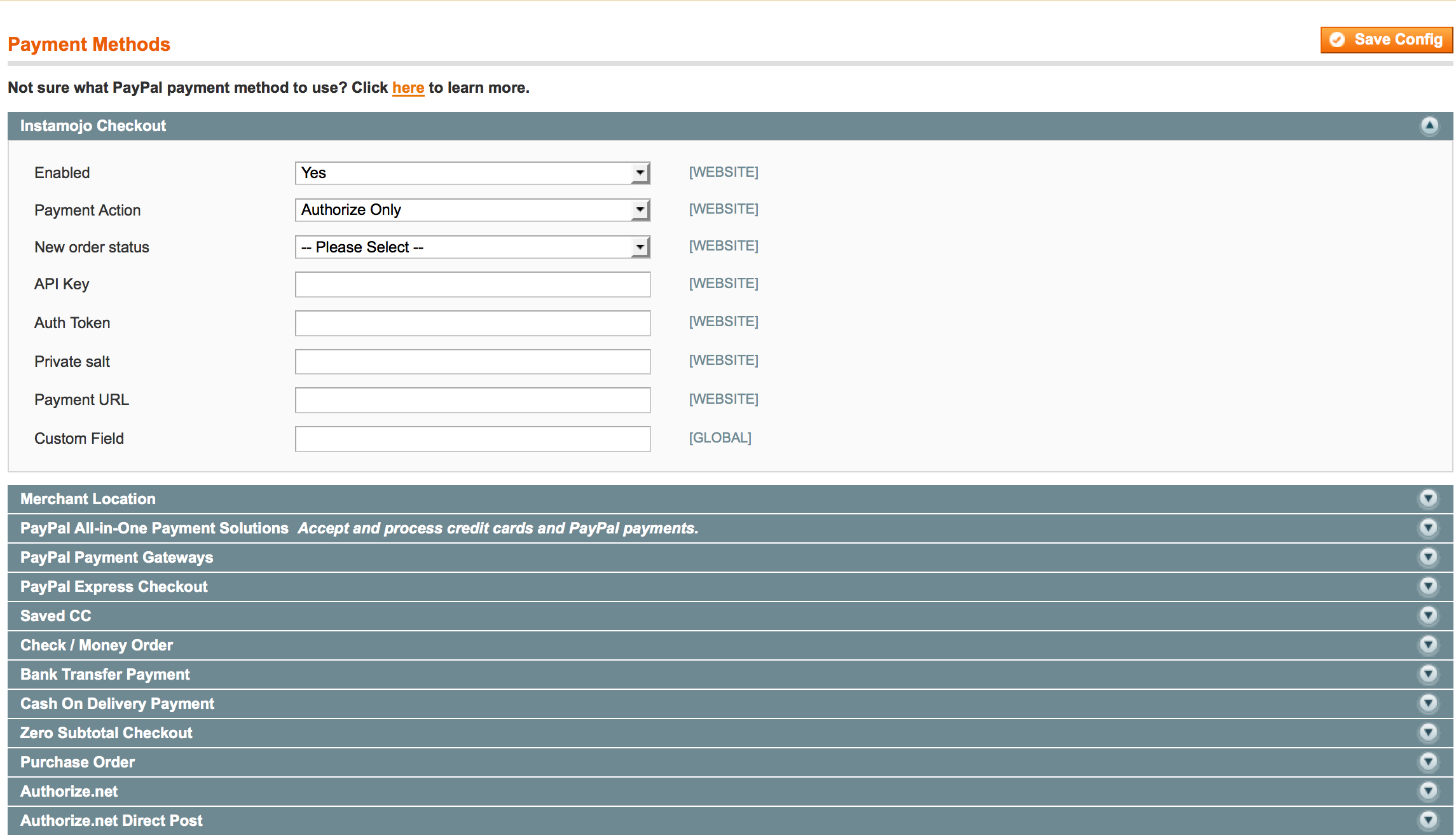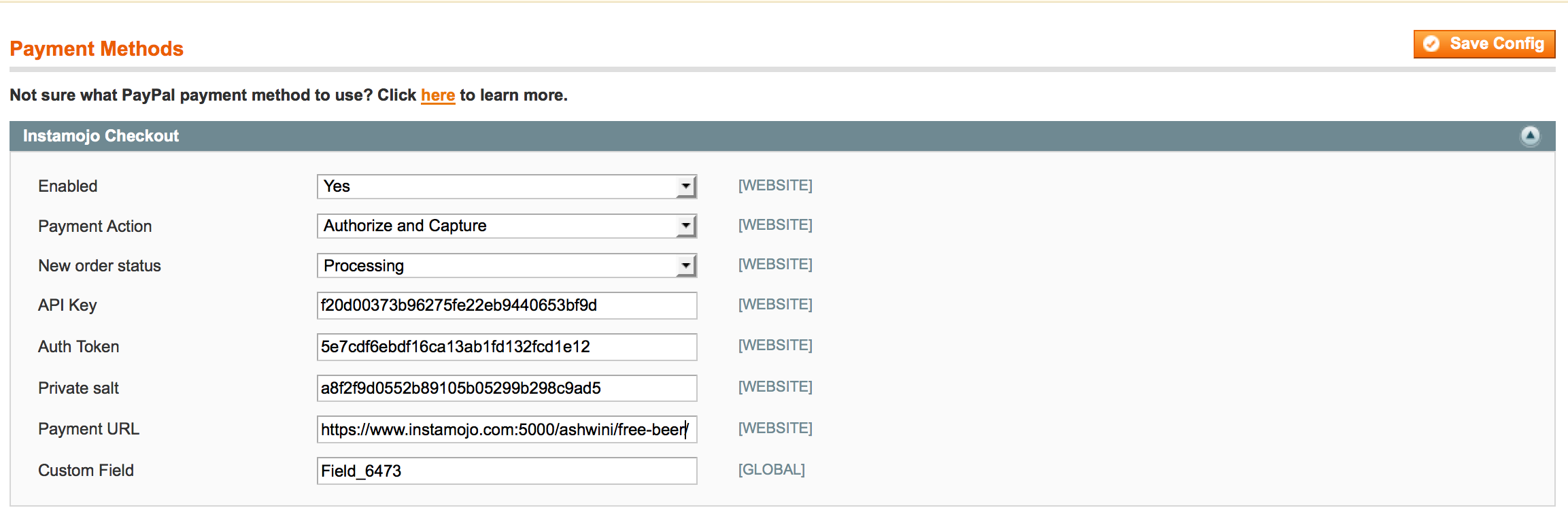 Click on Save Config to save these settings. Now we are ready to use Instamojo as payment gateway.