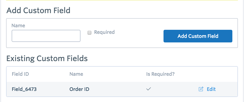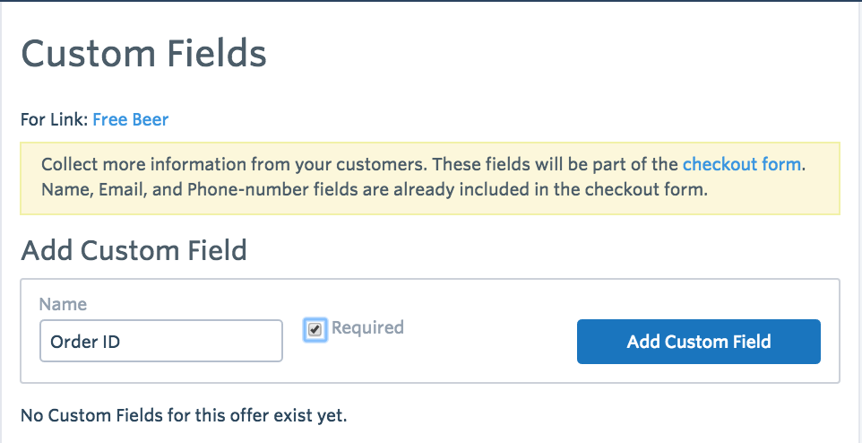 - On the product page go to More options and click on Custom Fields. Create a custom field called Order ID and mark it as required. Click on Add Custom Field to save this custom field.