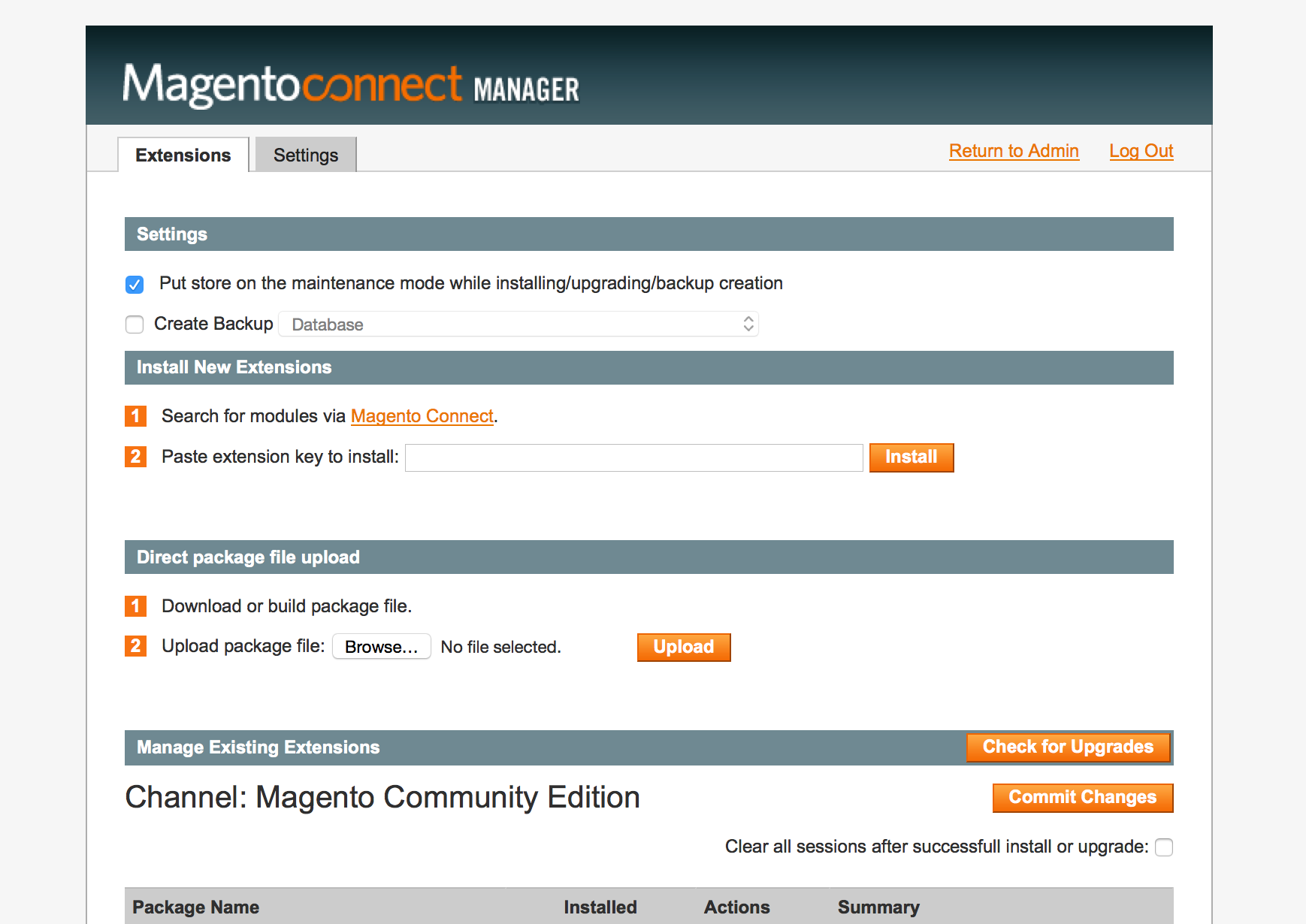 Now go back to the previous page by clicking on Extensions and enter http://connect20.magentocommerce.com/community/Instamojo_Imojo in Paste extension key to install under Install New Extensions: