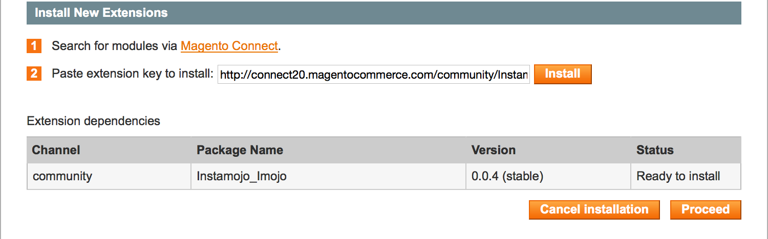 Now click on Install and after that Magento will show you a package by the name of Instamojo_Imojo with some version number. Now click on "Proceed" to install the extension(Note: Always choose the latest stable version in case it is displaying multiple options)