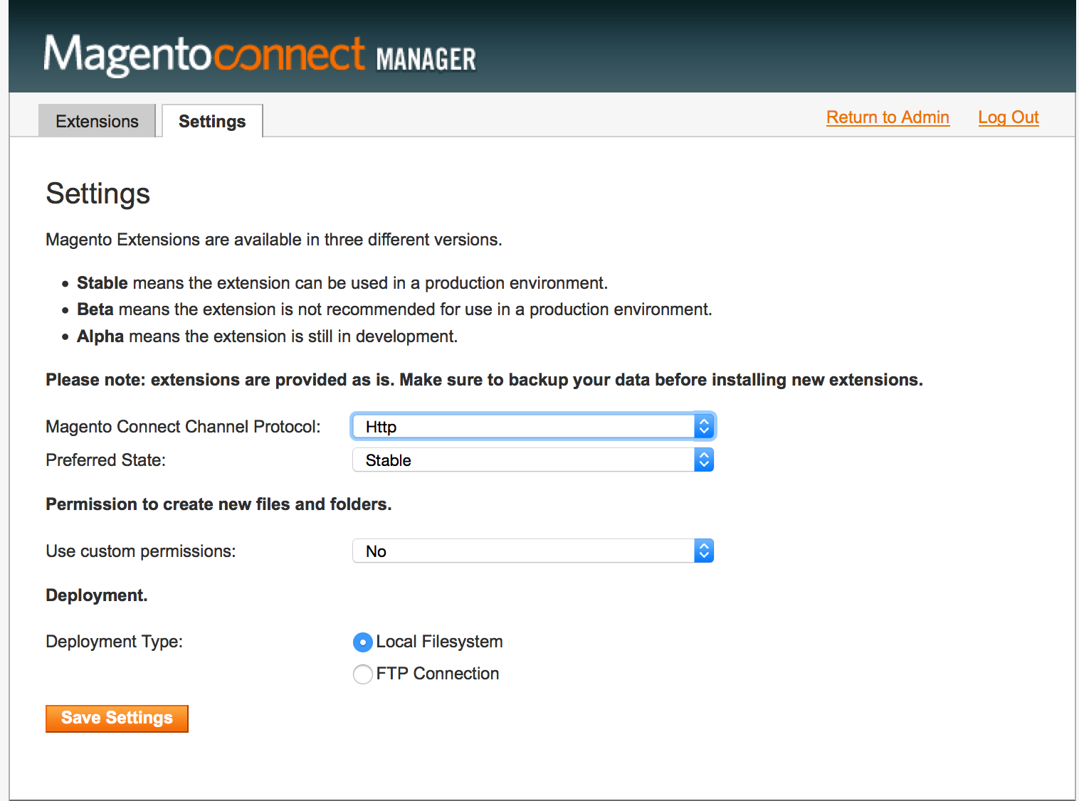 And change the value of Magento Connect Channel Protocol from "Https" to "Http" and click on Save Settings.