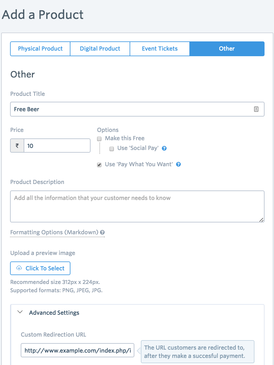 Create a product by clicking on Add a Product on your Instamojo dashboard and choose the category Other.