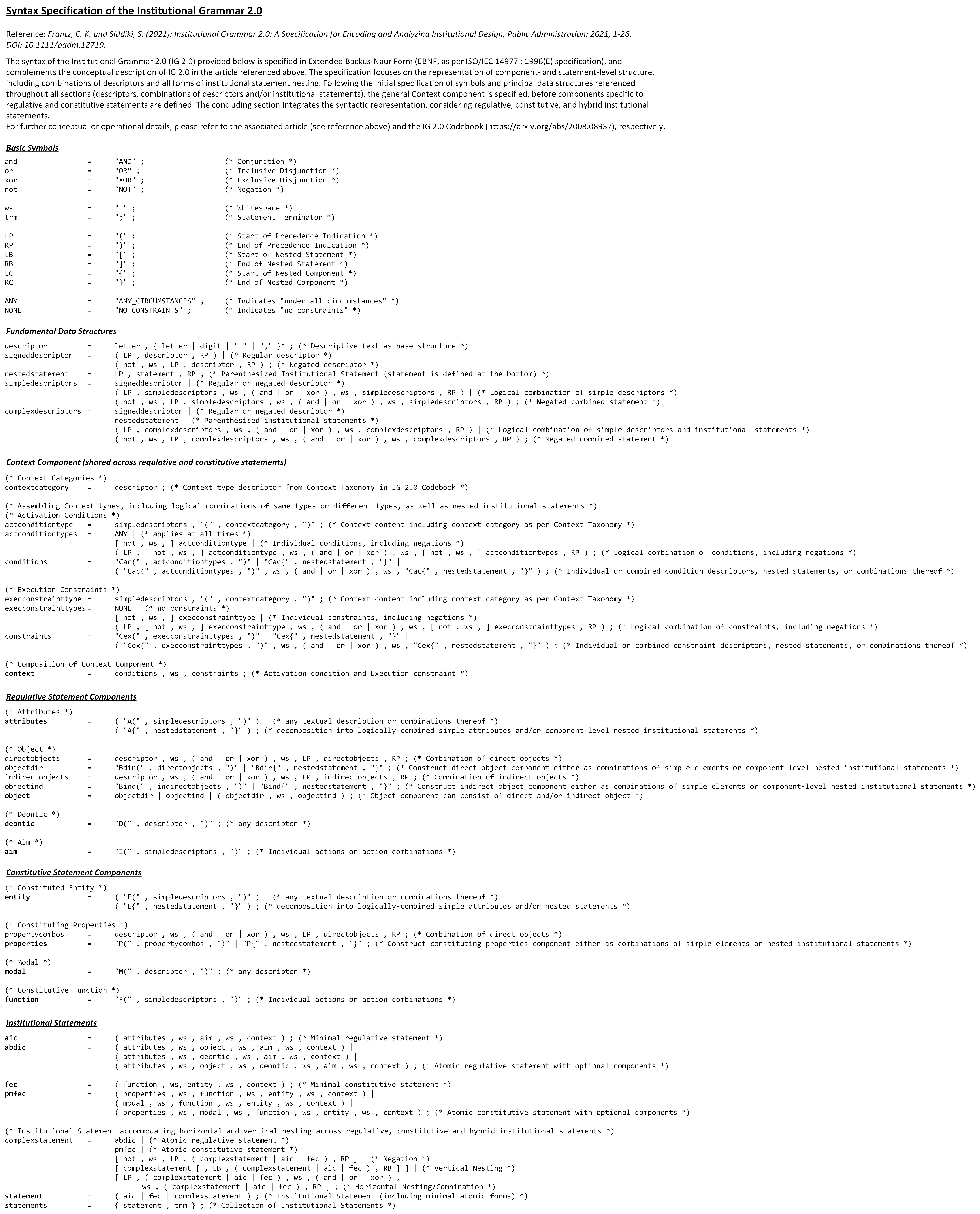 Frantz, C. K. and Siddiki, S. (2021): Institutional Grammar 2.0: A Specification for Encoding and Analyzing Institutional Design, Public Administration, 2021, 99: 222–247. https://doi.org/10.1111/padm.12719