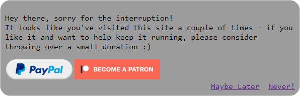 text: "Hey there, sorry for the interruption!\nIt looks like you've visited this site a couple of times - if you like it and want to help keep it running, please consider throwing over a small donation :)",// Text of the popup