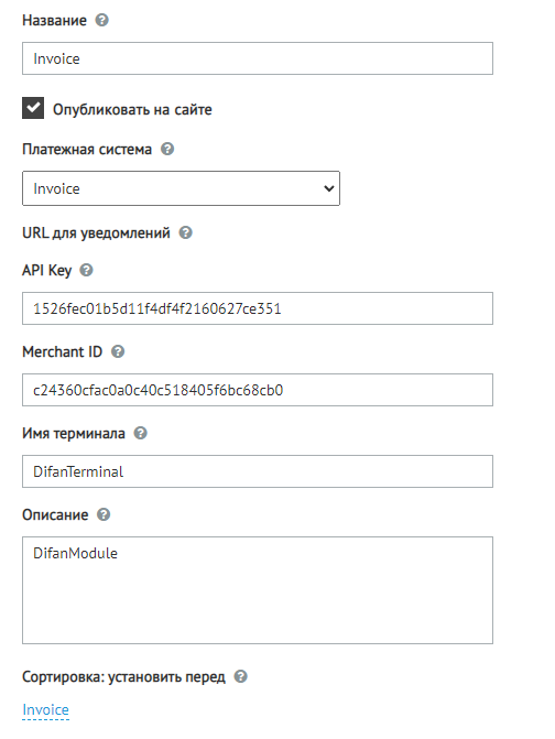 Invoice Payment Module Установка Скачайте плагин Распакуйте архив в корневую директорию сайта Перейдите во вкладку Оплата->Методы оплаты, затем нажмите "Добавить" Заполните форму, как показано на скриншоте Api ключ и Merchant Id в личном кабинете Invoice: Terminal Id: Добавьте уведомление в личном кабинете Invoice(Вкладка Настройки->Уведомления->Добавить) с типом WebHook и адресом: %URL сайта%/payment/get/invoice