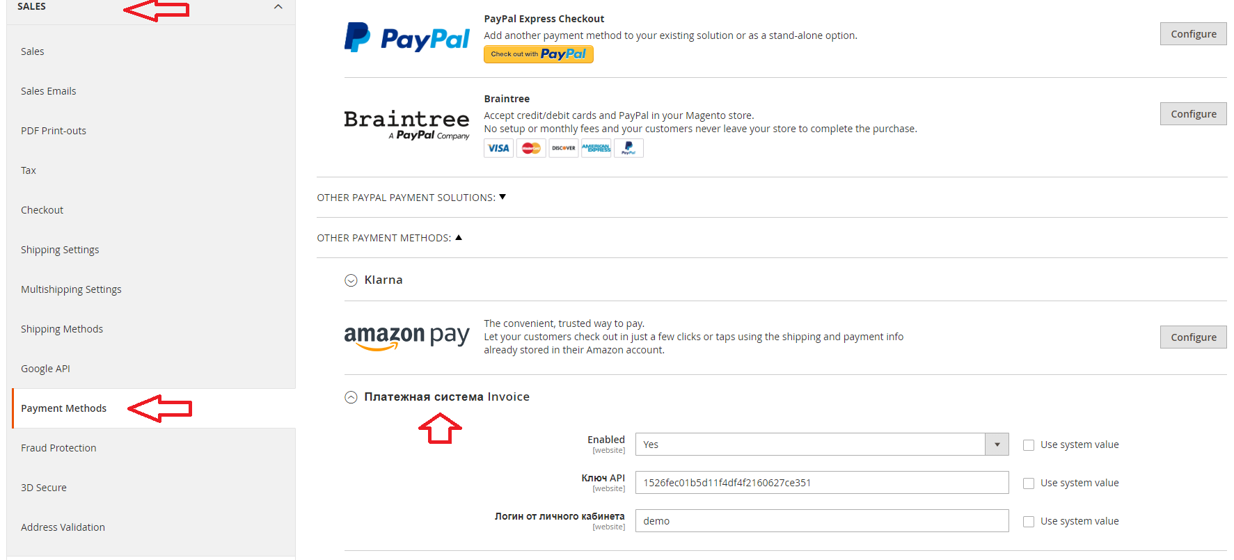 - Перейдите во вкладку Sales->Payment methods->Платежная система Invoice и введите ваши данные