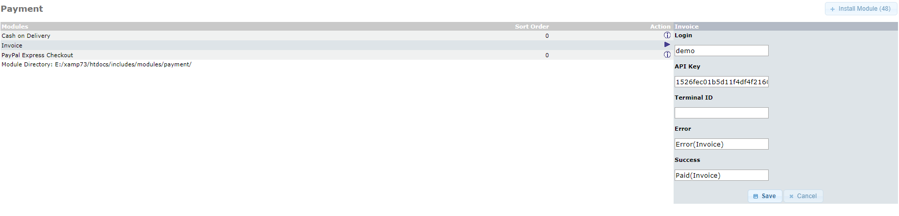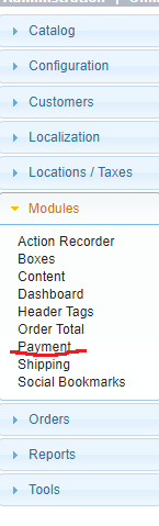 - Зайдите в панель администратора, во вкладку Modules->Payment, нажмите кнопку Install Module