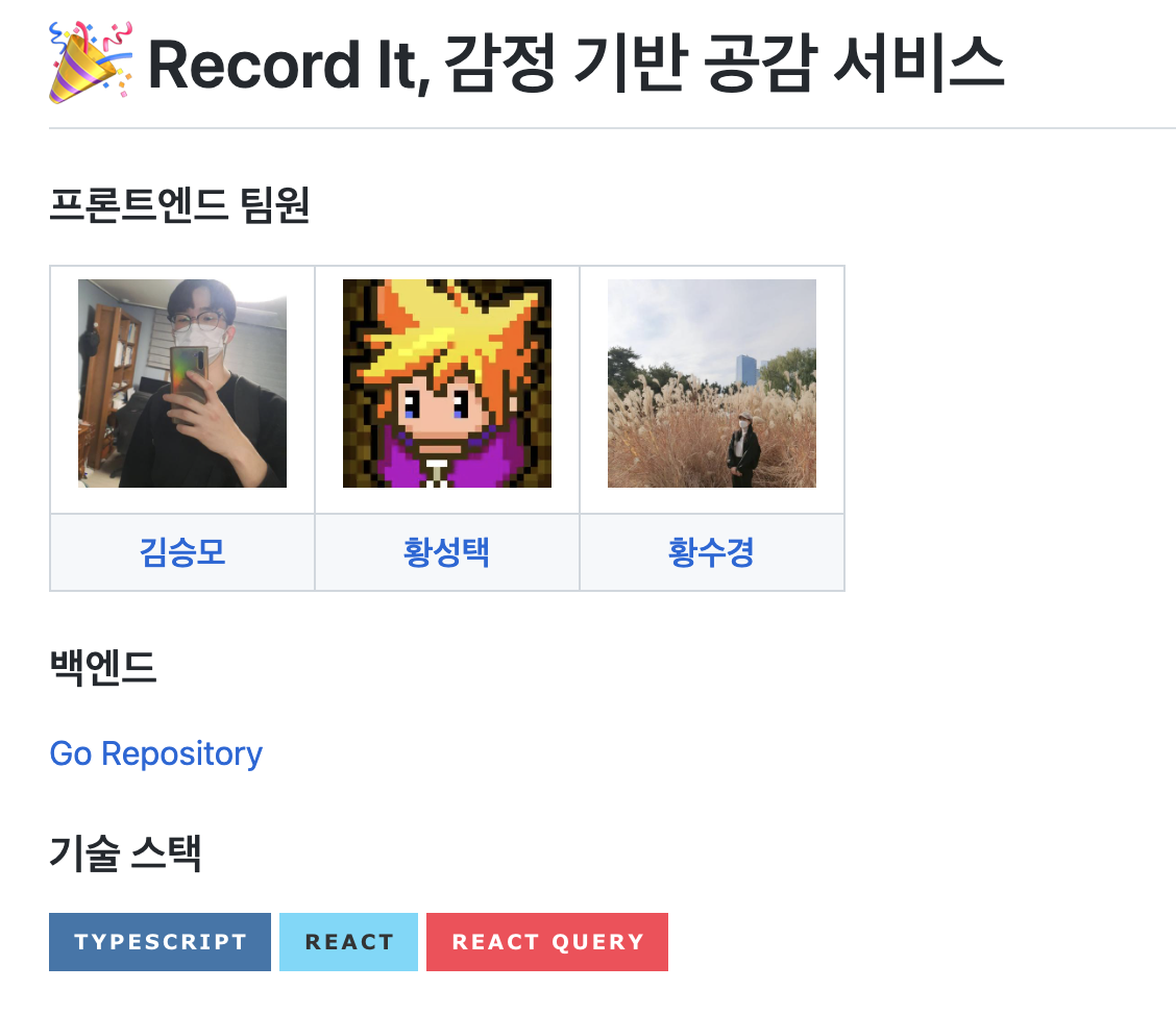 프론트 백 각자의 레파지토리에서는 기술 위주로 적는 것이 좋을 것 같다고 생각했습니다. 의견있으면 댓글 부탁드려욤