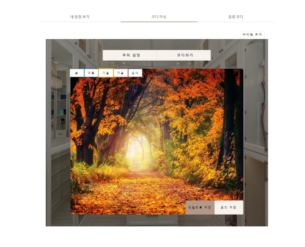 옷장 기능은 여러분들이 가지고 계신 옷을 직접 저장하여 코디해볼수 있도록 도움을 드리는 서비스입니다.