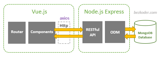 - Vue: la capa de vista de la aplicación, proporcionando un sistema de componentes reutilizables y una sintaxis declarativa para la manipulación del DOM