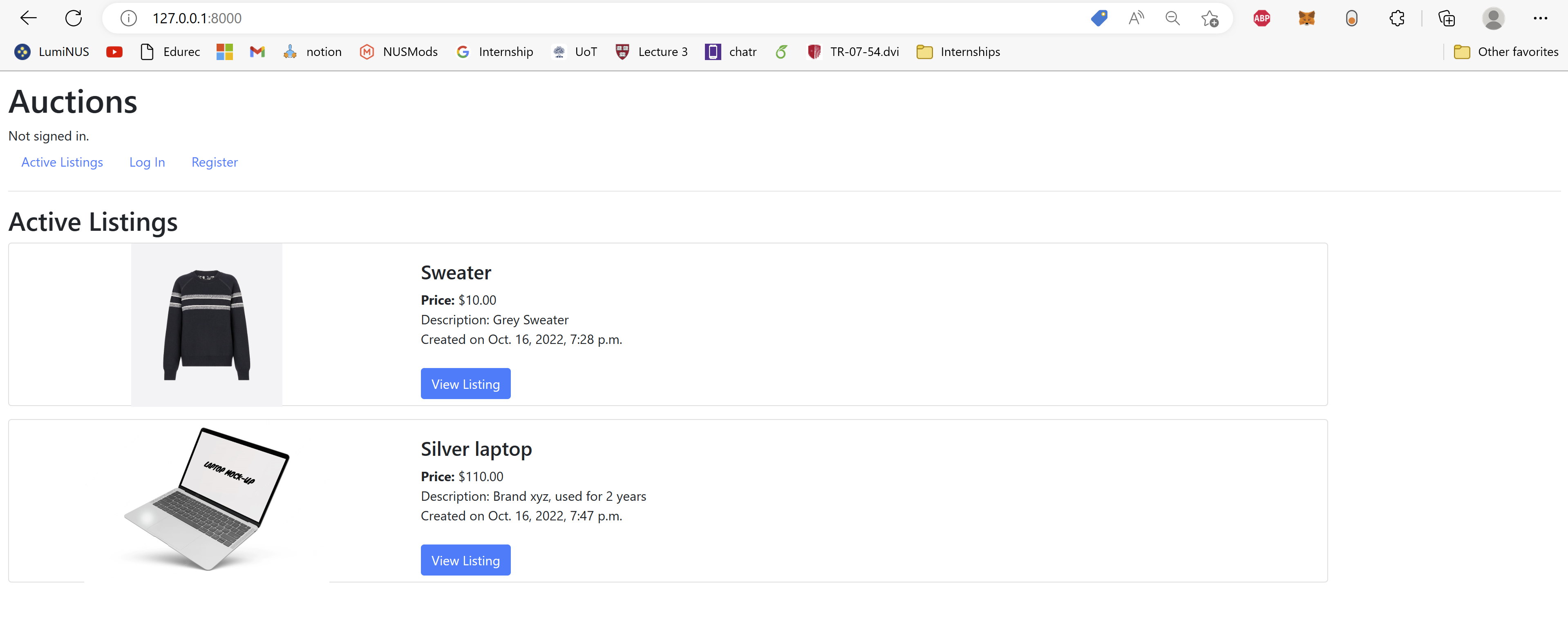 - Lets user view all active auction listings with a title, description, photo and current bid