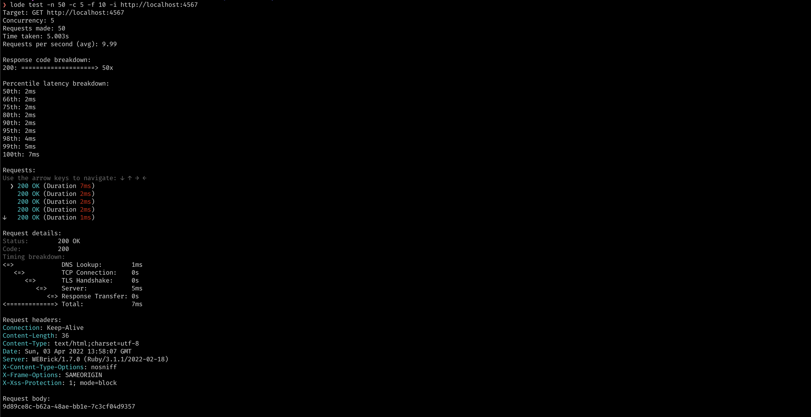 ❯ lode test --freq=20 -c 8 -l 5s http://my.example.service