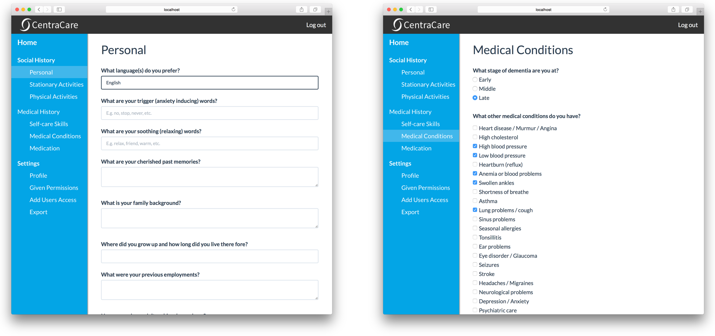 Long-term care homes gather similar information during the intake process, but this happens once your loved one has late stage dementia and you have less than a week to gather information and send your loved one to an institution. Our goal is to proactively start this information translation process right at the diagnosis. Not only will you gather richer information, but your loved one can be an active participant in the process of designing their own care. Unlike EHRs and clinical patient summaries, we focus on translating the social aspects of the person’s life, to provide the most personalized medical experience for the person with dementia. After an extensive search of the literature, we found that there is no tool that reaches our application’s capacity. Finally, we’re focused on providing a comprehensive, and holistic overview of care. We selected the questions in our record system by reviewing an extensive body of research, including initiatives spearheaded by the Ontario Ministry of Health. This positions us to provide richer, and more trustworthy data than what a family might record in a word document or notebook.