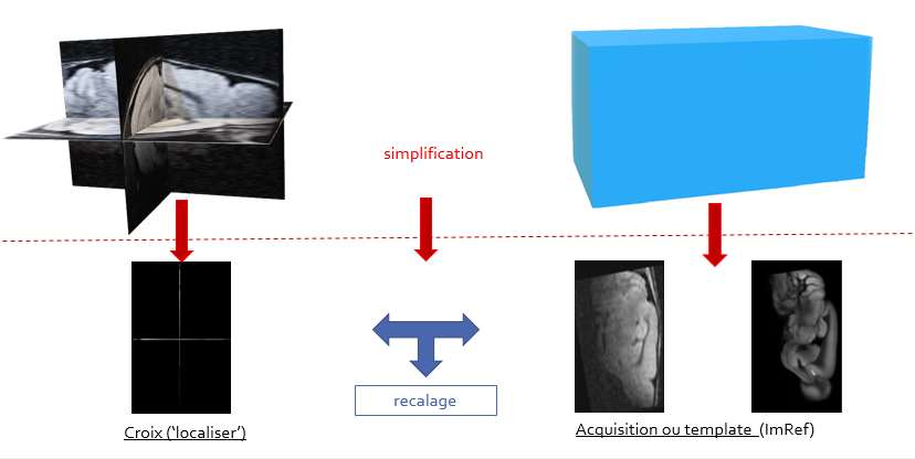 To obtain an MRI image at week x of the same volume as at week x-1, we first launch the rapid acquisition of a low resolution image composed of each of the three plans of the volume. This image will be called the ‘localizer’. We will readjust this last with the 3D volume (in blue on the right on the diagram) previously acquired, which will give the translation and rotation factors (according to x, y and theta) to enter into the software MRI positioning.