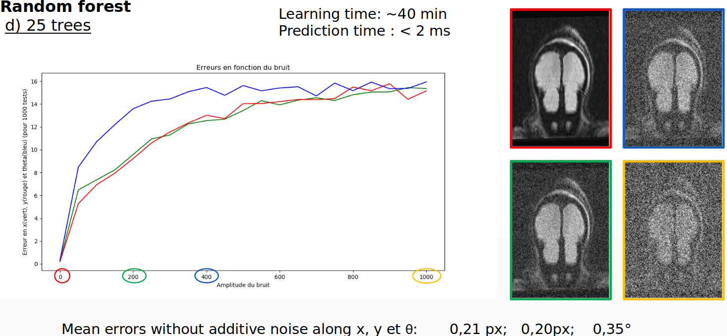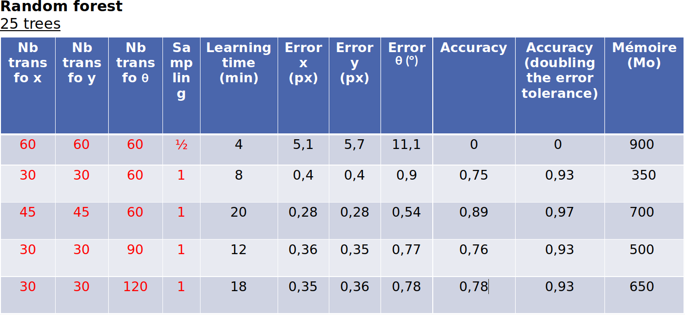 For the random forest regression with 25 trees trained on the acquisition, the success rate is 94%, the learning time is 40 minutes and prediction time is 2 milliseconds.
