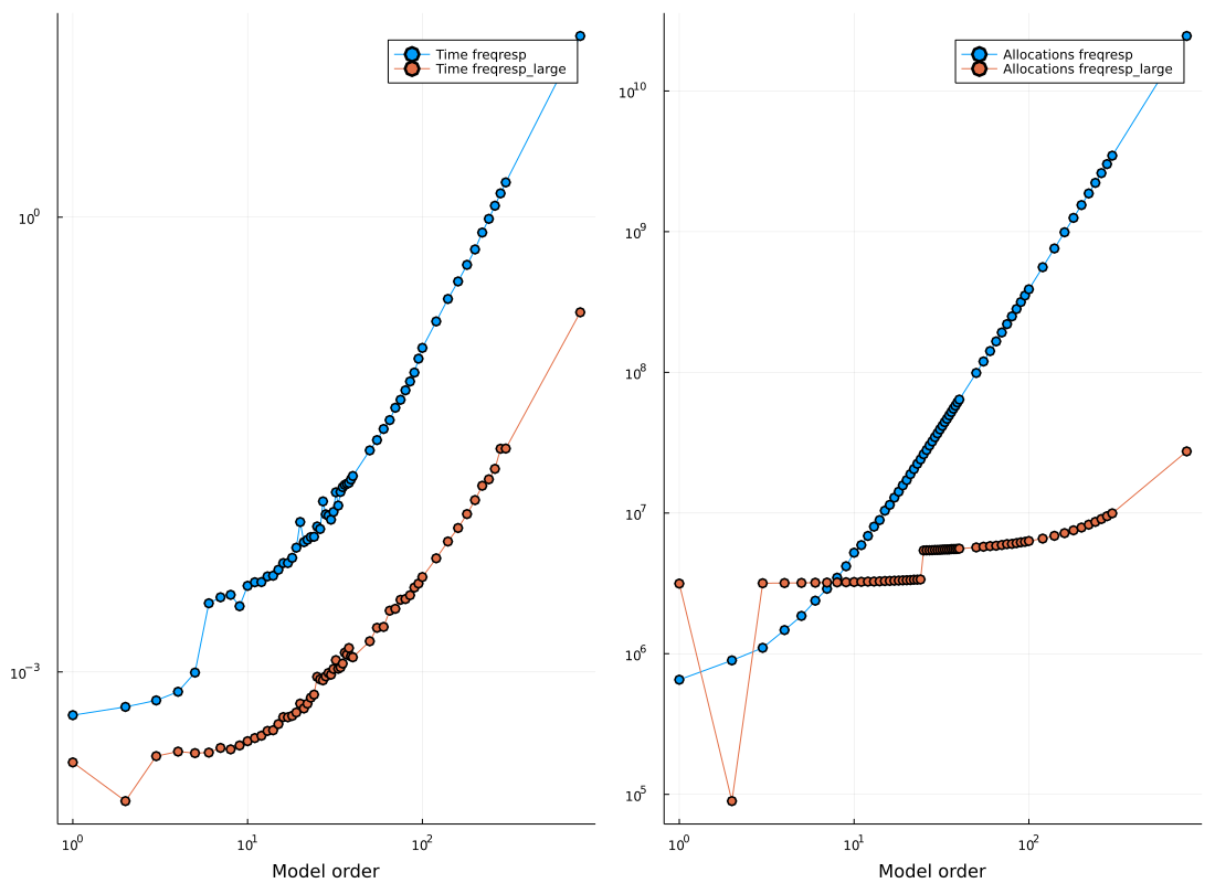 freqresp. The new version is labelled "large" because I had originally intended to use it for large systems only, but it turned out to be faster across the board. The benchmark is performed on a 2x2 system with varying order of the state, evaluating the freqresp on 200 frequency points.