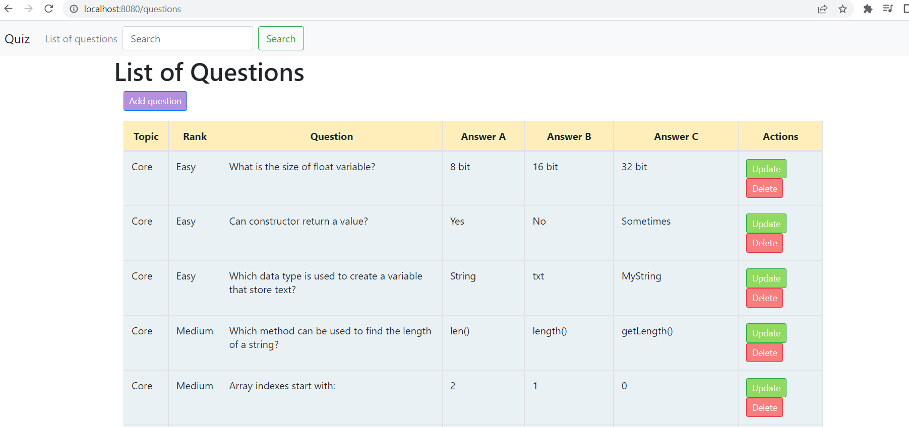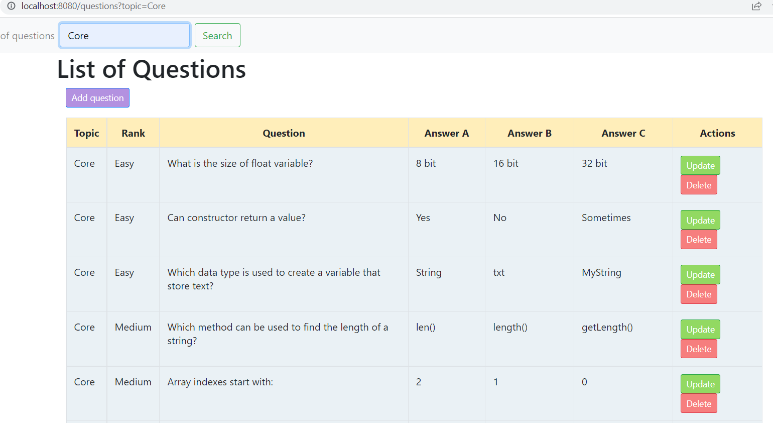 JavaQuizApp Java CRUD application with HTML pages created by Thymeleaf The application is covered with JUnit tests Framework: Spring Boot; Libraries:Lombok,Junit,Mockito; Migration:Liquibase; DB:Postgres; FrontEnd:Thymeleaf;