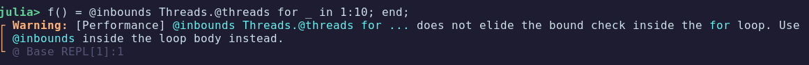 @inbounds @threads forand@inbounds @spawnfor their attempt to improve performance [1]. Since@inboundsdoes not work across function boundaries, these annotations are useless and people can be confused by the performance of the code. So, it is rather tempting to just warn the users while expanding@inboundswhich is much more efficient than keep paying attention in discourse/slack/zulip. What do people think about this kind of approach? Would it be too noisy?Here's an example output: