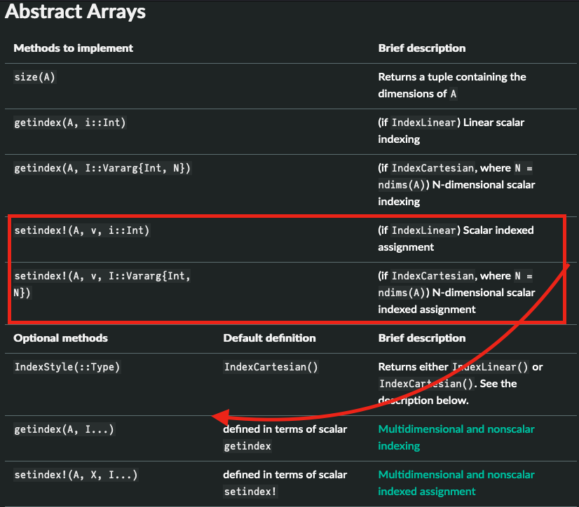 setindex!is not an optional method.This PR will move the two lines in the red box here to the Optional methods section, between