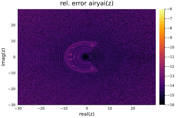 So having dedicated routines allows for much better accuracy and speed. Of course, I have also added support for the entire complex plane. The motivation for this is some of the uniform asymptotic expansions for bessel functions require evalulation of the airy functions (https://dlmf.nist.gov/10.20) so this may come in handy as we look at those for complex plane.