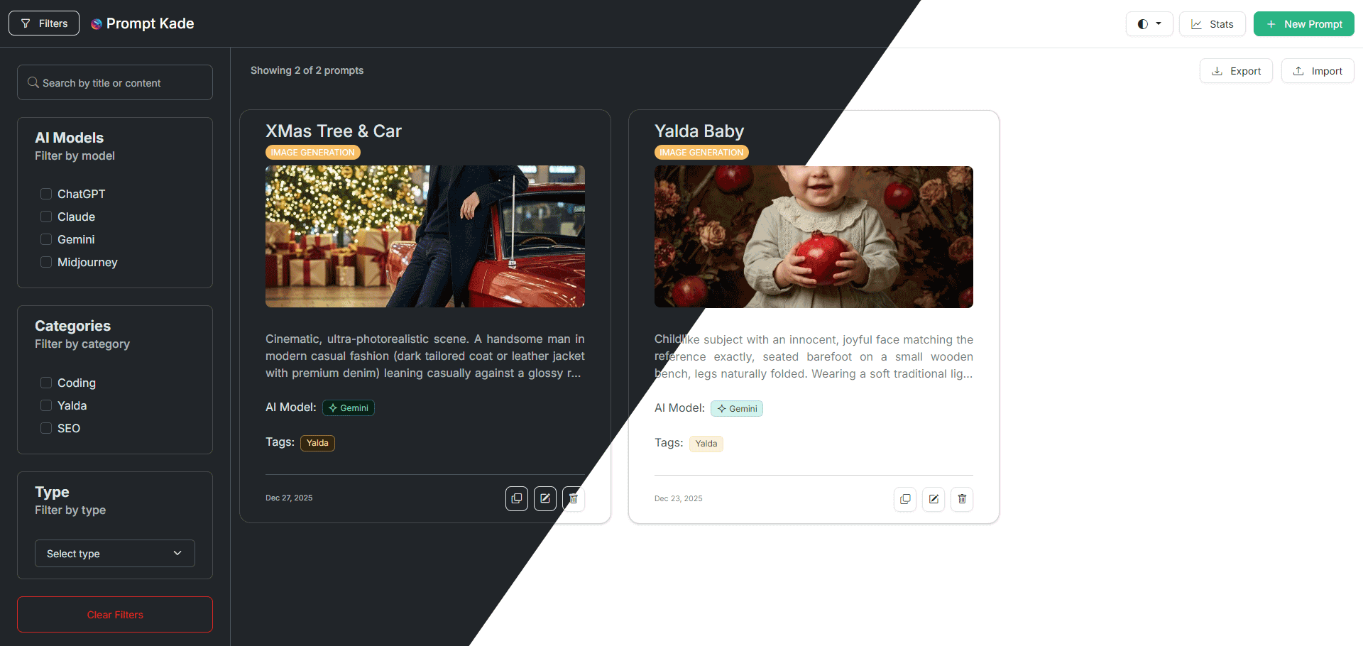Prompt Kade is a web application for managing and organizing your own personal library of AI prompts. It provides a simple interface to store, categorize and quickly find the prompts you need.