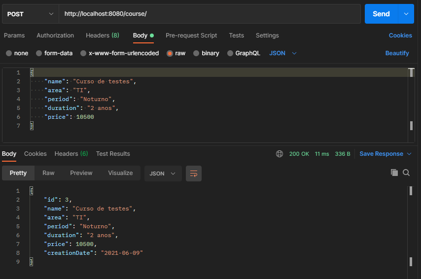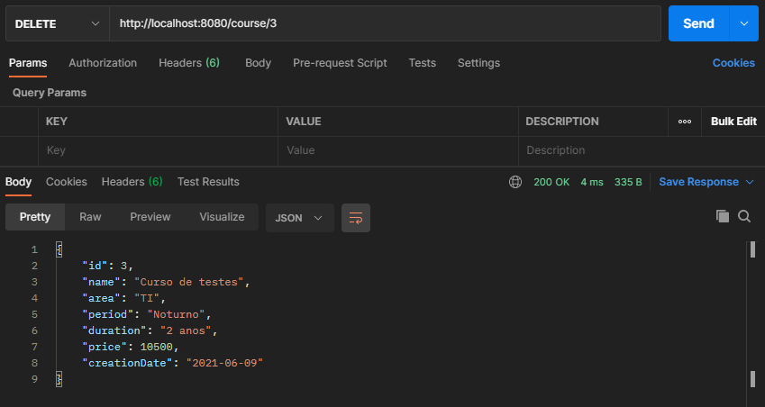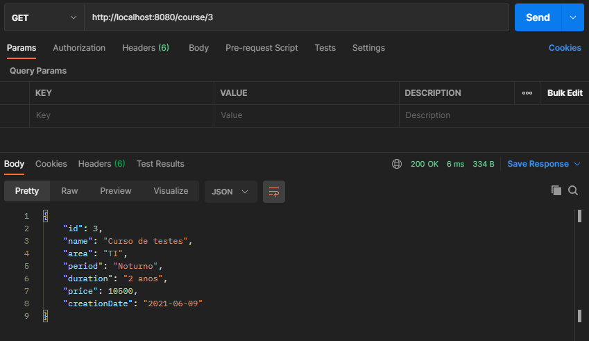 Java-API API JAVA utilizando com Spring boot onde o serviço permite registrar, consultar alterar e deletar cursos. Endpoints disponíveis: /course/ (GET, POST e PUT) /course/{id} (GET e DELETE) Serviços Consultar cursos existentes: Adicionar um curso: Modificar um curso: Consultar curso por id Deletar curso por id