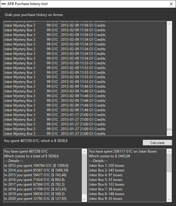 I used to use a .jar file to parse through the purchase history, but that hasn't been updated in years so I wanted to have an up to date version which includes the G1C/$ changes from 2018.