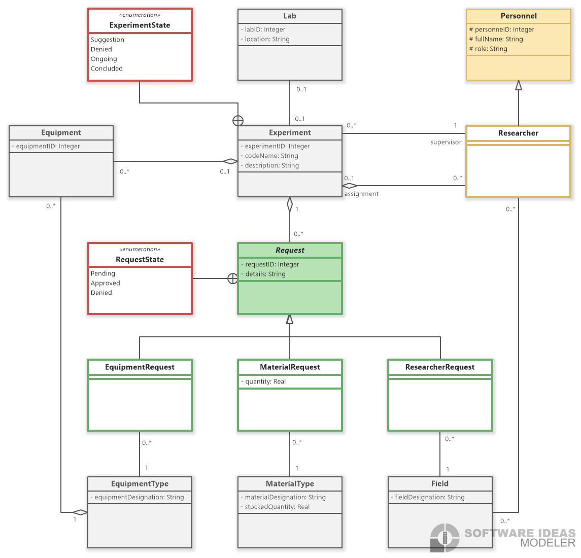 personnel(personnel_id, full_name, role, login, password)researcher(#researcher_id, full_name, #experiment_id)field(field_designation)specialty(#researcher_id, #field_designation)lab(lab_id, location)experiment(experiment_id, #researcher_id, state, code_name, description, #lab_id)material_type(material_designation, stocked_quantity)equipment_type(equipment_designation)equipment(equipment_id, #equipment_designation, #experiment_id)request(request_id, state, type, #experiment_id, #field_designation, #material_designation, #equipment_designation, quantity, details)