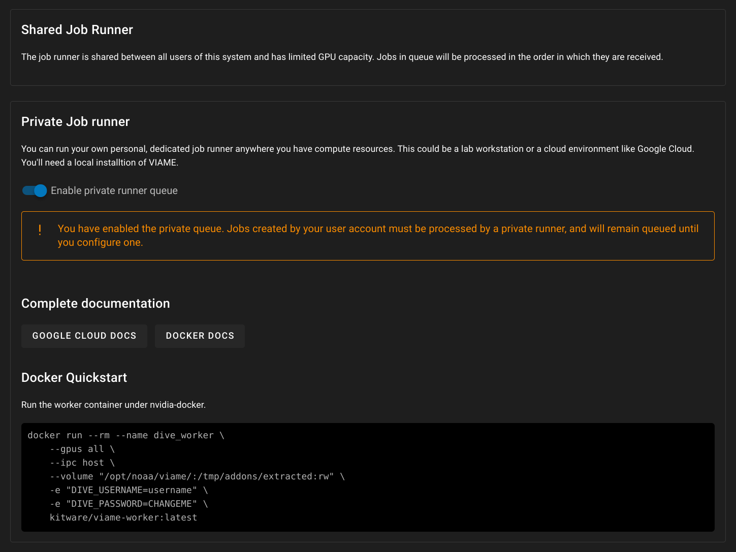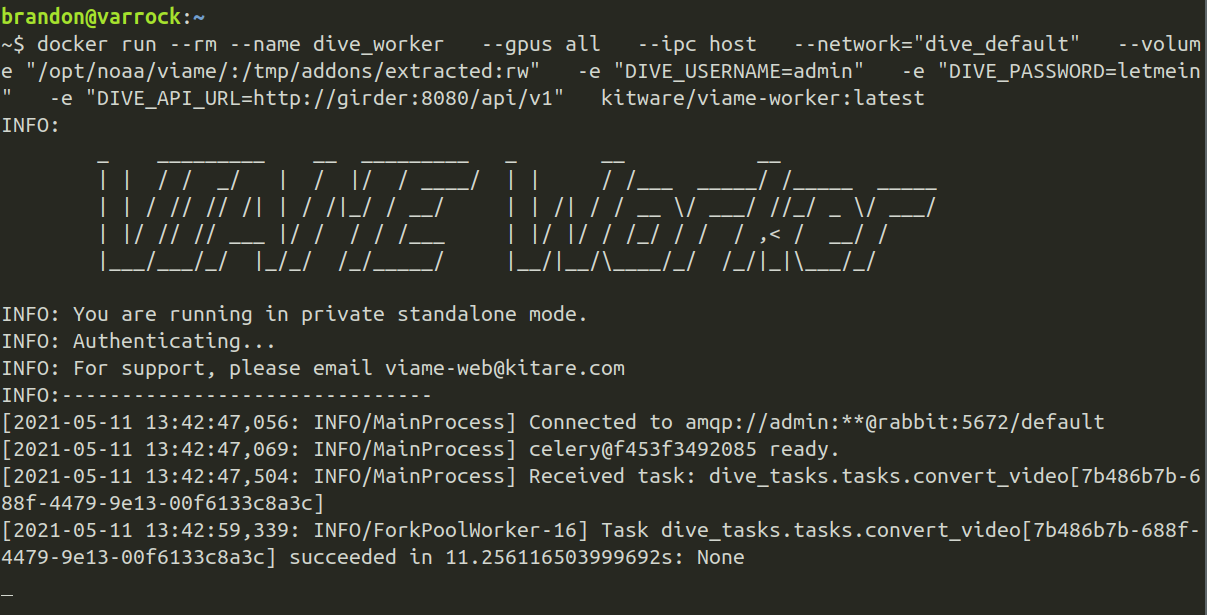 - During the setup the user should have an understanding that using a remote worker with data stored on viame.kitware.com will require downloading all of the data from viame.kitware.com. Meaning that if someone is trying to run pipelines on cloned datasets in the public collection they will be ingesting a lot and our server will be transferring a lot?