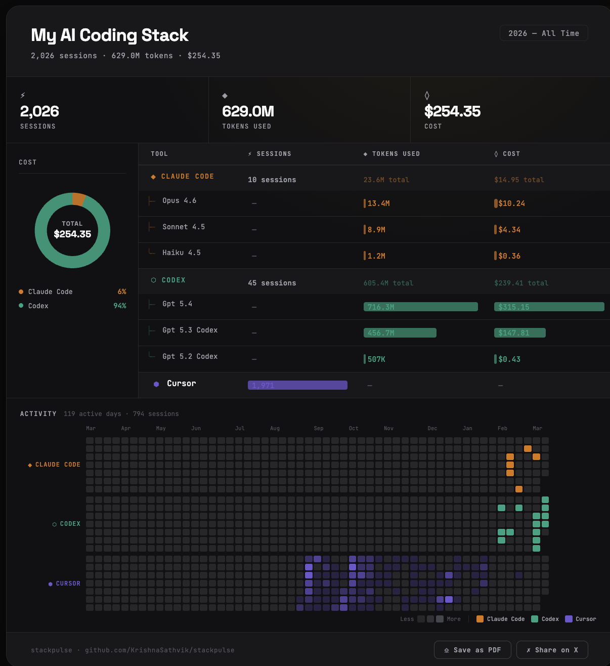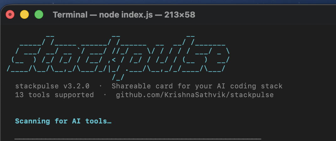 stackpulse scans your machine for AI coding tools, reads their local usage data (sessions, tokens, cost), and generates a shareable HTML card with: