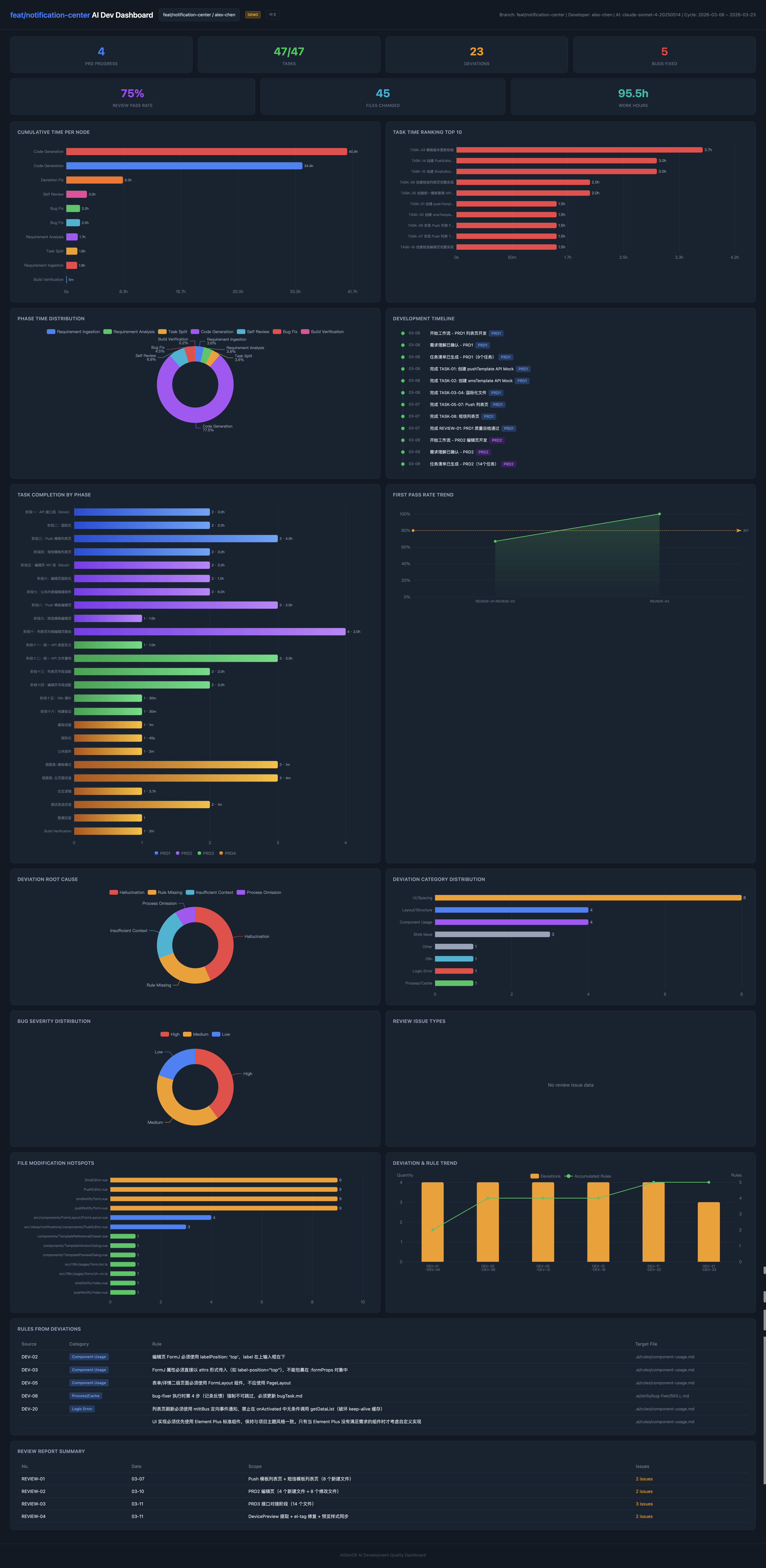 Every KPI card is clickable β drill down into task details, deviation root causes, review reports, and file changes.