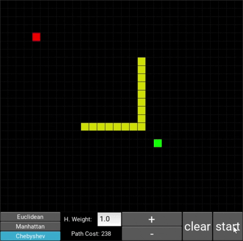- This is the standard configuration, which is the classic A* search algorithm. The heuristic weight is set to 1. With this heuristic, the shortest path will always be found. You can also choose from 3 distance metrics, which are used to calculate the distance between two nodes: Euclidean, Manhattan and Chebyshev.