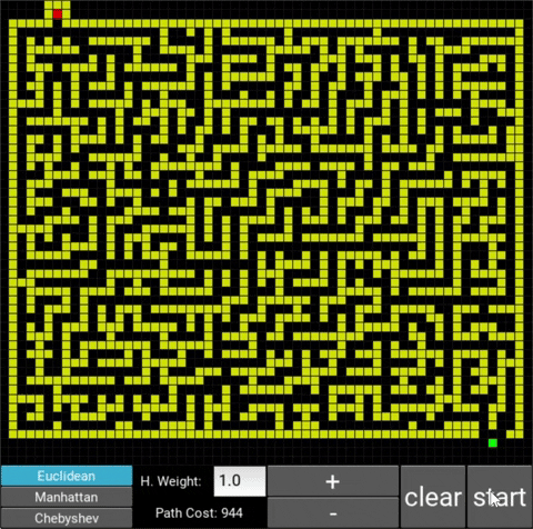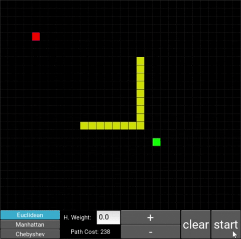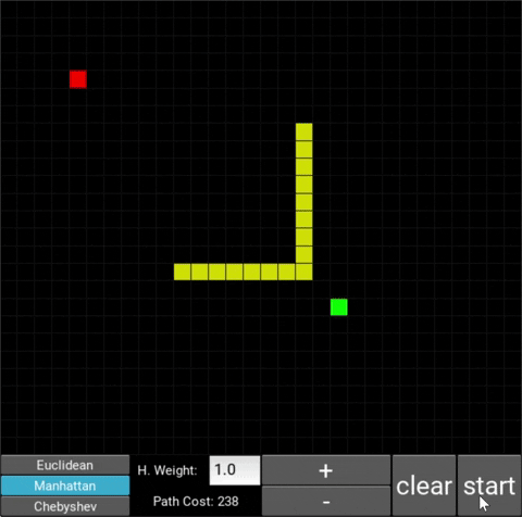 - You can use the mouse cursor to draw obstacles onto the grid (in yellow).