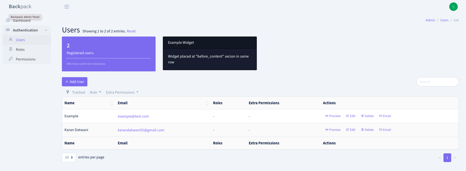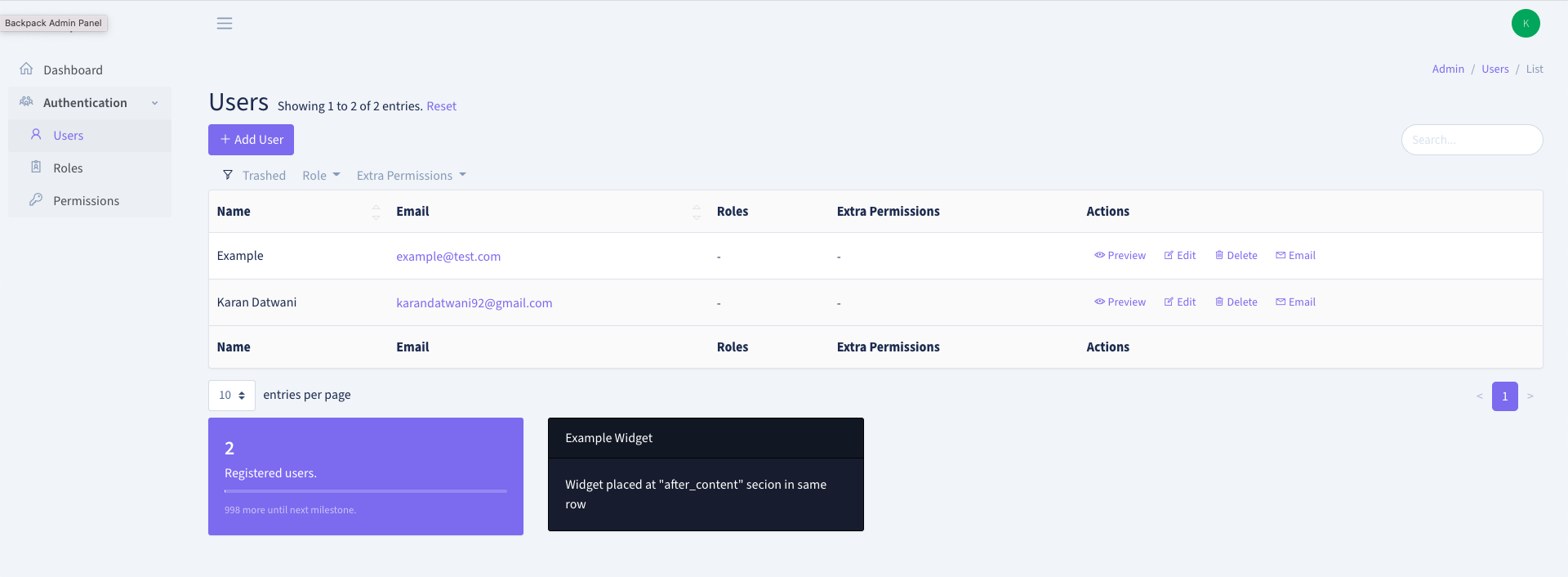 Widgets (aka cards, aka charts, aka graphs) provide a simple way to insert blade files into admin panel pages. You can use them to insert cards, charts, notices or custom content into pages. You can use the default widget types or create your own custom widgets.
