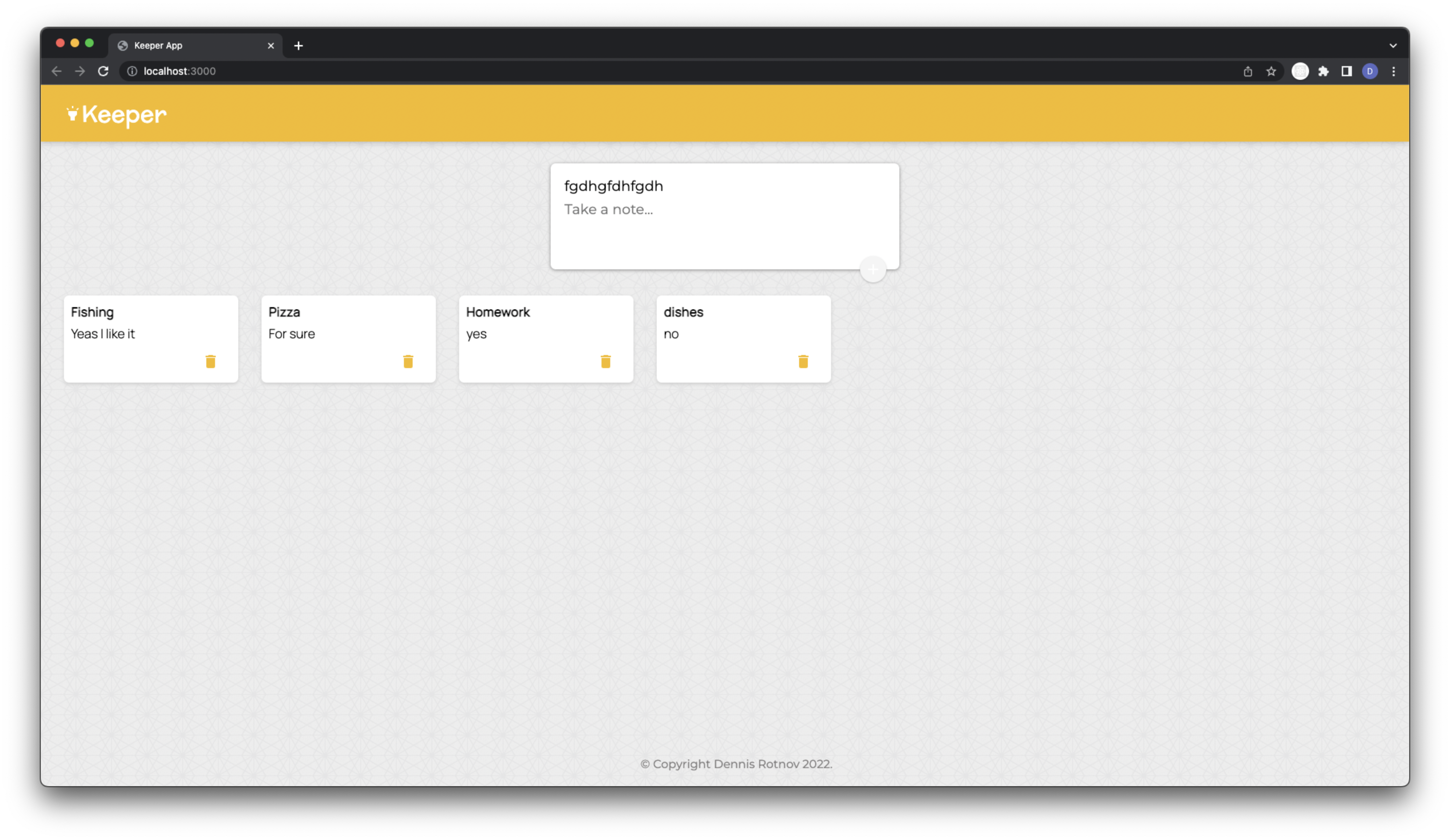 Keeper app with React JS. Purpose Challenged by London App Brewery. Copyright by London App Brewery. Coded by Dennis Rotnov. Process Built using NodeJS, React JS Video on youtube Please watch a short video Screenshots