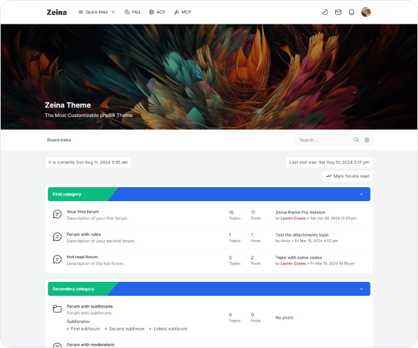 Zeina is a phpBB theme with a clean and modern design that is fully responsive to all types of devices and easy to navigate and use.