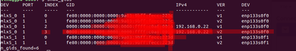 - The second two entries: the infinband devices are matched with net devices, check with ibdev2netdev. In your case you have the only first interface/netdevice is UP, so entries on port 1 index 2/3 belong to IP address 192.168.0.22 on enp133s0f0 ( 2/3 are not mapped for enp133s0f1). Since all machines have the same table, we need to use the index 3 for all of them. ** We should have the GID index (network layer, similar to IP address) for RoCE - RoCE doesn't work with LID-based routing (performing RDMA over Ethernet not Infiniband).