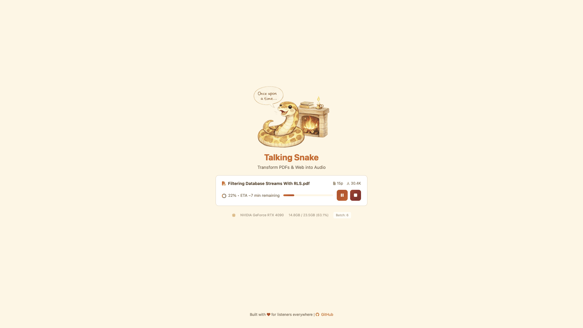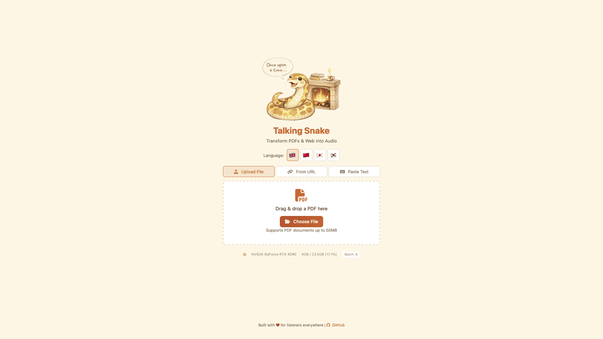 uv sync && uv run --no-sync talking-snake --port 8888 # Open http://localhost:8888Flash Attention requires matching your CUDA driver version. Check yours with nvidia-smi (top right shows "CUDA Version").
