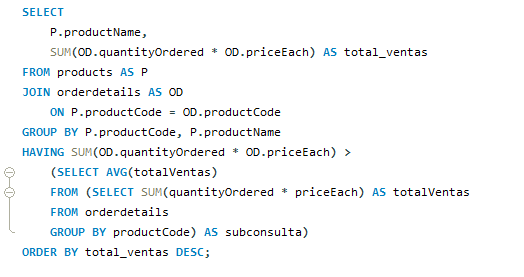- Ejercicio 1: Calcula el total de ventas para cada producto (cantidadOrdered * priceEach) y muestra solo aquellos productos cuyo total supere el promedio de ventas de todos los productos, ordenado de mayor a menor.