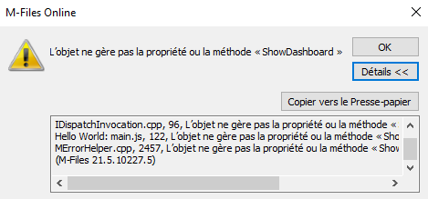 IDispatchInvocation.cpp, 96, L’objet ne gère pas la propriété ou la méthode « ShowDashboard » (0x80040008)